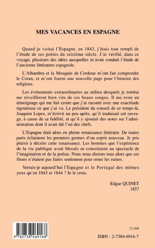 Quand je visitai l'Espagne, en 1843, j'étais tout rempli de l'étude des poètes du seizième siècle. L'Espagne était alors en pleine renaissance littéraire. De toutes parts éclataient les premiers germes d'un esprit nouveau. Je pris plaisir à décrire cette renaissance. Les hommes que l'expérience de la vie publique avait blessés se consolaient au spectacle de l'imagination et de la poésie. Verrai-je aujourd'hui l'Espagne et le Portugal des mêmes yeux qu'en 1843 et 1844 ? Je le crois. Edgar QUINET 1857