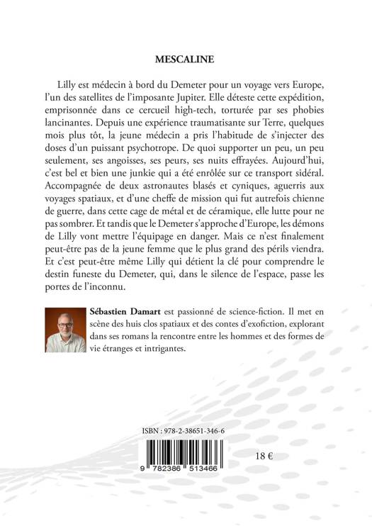 Lilly est médecin à bord du Demeter pour un voyage vers Europe, l’un des satellites de l’imposante Jupiter. Elle déteste cette expédition, emprisonnée dans ce cercueil high-tech, torturée par ses phobies lancinantes. Depuis une expérience traumatisante sur Terre, quelques mois plus tôt, la jeune médecin a pris l’habitude de s’injecter des doses d’un puissant psychotrope. De quoi supporter un peu, un peu seulement, ses angoisses, ses peurs, ses nuits effrayées. Aujourd’hui, c’est bel et bien une junkie qui a été enrôlée sur ce transport sidéral. Accompagnée de deux astronautes blasés et cyniques, aguerris aux voyages spatiaux, et d’une cheffe de mission qui fut autrefois chienne de guerre, dans cette cage de métal et de céramique, elle lutte pour ne pas sombrer. Et tandis que le Demeter s’approche d’Europe, les démons de Lilly vont mettre l’équipage en danger. Mais ce n’est finalement peut-être pas de la jeune femme que le plus grand des périls viendra. Et c’est peut-être même Lilly qui détient la clé pour comprendre le destin funeste du Demeter, qui, dans le silence de l’espace, passe les portes de l’inconnu.