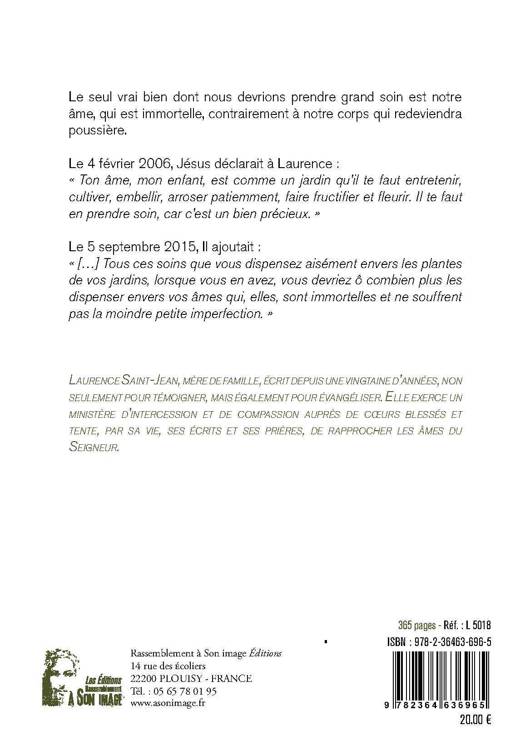 Par ce nouveau livre sur l'âme et le Salut des âmes, Laurence Saint-Jean nous introduit dans les beaux enseignements que lui a confiés le Ciel pour notre édification. À travers le coeur à Coeur qu'Il entretient avec elle depuis vingt années maintenant, le Seigneur désire rejoindre l'humanité tout entière par les messages qu'Il lui communique. De nos jours, si peu de nos contemporains pensent qu'ils ont une âme et qu'il faut tout mettre en oeuvre, durant le court temps de notre existence, pour la sauver. Or tant d'autres préoccupations nous occupent ou retiennent notre attention, alors que le seul vrai bien dont nous devrions prendre grand soin est notre âme, qui est immortelle, contrairement à notre corps qui redeviendra poussière. Laissons-nous toucher profondément par l'Amour infini et miséricordieux de Notre Dieu, afin que nous devenions soucieux d'oeuvrer pour Sa Gloire et pour le Salut de notre humanité.