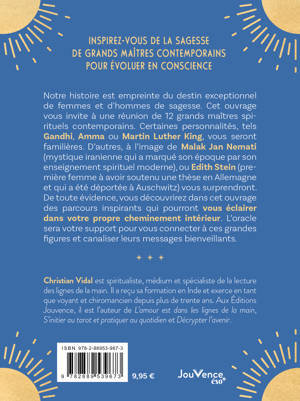 Notre histoire est empreinte du destin exceptionnel de femmes et d’hommes de sagesse. Cet ouvrage vous invite à une réunion de 12 grands maîtres spirituels contemporains. Certaines personnalités, tels Gandhi, Amma ou Martin Luther King, vous seront familières. D’autres, à l’image de Malak Jan Nemati (mystique iranienne qui a marqué son époque par son enseignement spirituel moderne), ou Edith Stein (première femme à avoir soutenu une thèse en Allemagne et qui a été déportée à Auschwitz) vous surprendront. De toute évidence, vous découvrirez dans cet ouvrage des parcours inspirants qui pourront vous éclairer dans votre propre cheminement intérieur. L’oracle sera votre support pour vous connecter à ces grandes figures et canaliser leurs messages bienveillants.