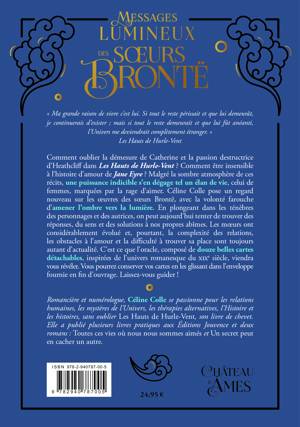 « Ma grande raison de vivre c’est lui. Si tout le reste périssait et que lui demeurât, je continuerais d’exister ; mais si tout le reste demeurait et que lui fût anéanti, l’Univers me deviendrait complètement étranger. » Les Hauts de Hurle-Vent Comment oublier la démesure de Catherine et la passion destructrice d’Heathcliff dans Les Hauts de Hurle-Vent ? Comment être insensible à l’histoire d’amour de Jane Eyre ? Malgré la sombre atmosphère de ces récits, une puissance indicible s’en dégage tel un élan de vie, celui de femmes, marquées par la rage d’aimer. Céline Colle pose un regard nouveau sur les œuvres des sœurs Brontë, avec la volonté farouche d’amener l’ombre vers la lumière. En plongeant dans les ténèbres des personnages et des autrices, on peut aujourd’hui tenter de trouver des réponses, du sens et des solutions à nos propres abîmes. Les mœurs ont considérablement évolué et, pourtant, la complexité des relations, les obstacles à l’amour et la difficulté à trouver sa place sont toujours autant d’actualité. C’est ce que l’oracle, composé de douze belles cartes détachables, inspirées de l’univers romanesque du xixe siècle, viendra vous révéler. Vous pourrez conserver vos cartes en les glissant dans l’enveloppe fournie en fin d’ouvrage. Laissez-vous guider !