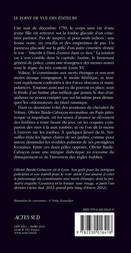 Dans ce deuxième volet des aventures du chevalier de Volnay, Olivier Barde-Cabuçon reconstitue un Paris pitto - resque et inquiétant, où les seaux d'aisance se déversent des fenêtres à toute heure du jour, où les coquins s'emparent des rues à la nuit tombée, et où l'on dit la messe à l'envers sur les tombes. À quelques lieues de là, Ver - sailles étale les lignes claires de ses jardins, comme pour mieux dissimuler les troubles pulsions de ses prestigieux locataires. Entre ces deux pôles opposés, Olivier Barde- Cabuçon noue une intrigue diabolique au royaume du détra quement et de l'inversion des règles établies.