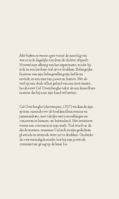 Cel Overberghe (Antwerpen, 1937) verdiende zijn sporen ruimschoots als beeldend kunstenaar en jazzmuzikant, met talrijke tentoonstellingen en concerten in binnen- en buitenland. Het intuïtieve vormt een constante in zijn werk. Taal wordt er de derde materie, waarmee Cel zich in zijn gedichten plastisch en ritmisch weet uit te drukken. Ondanks de oververzadigde markt, laat hij zijn poëtisch commentaar graag op de lezer los.