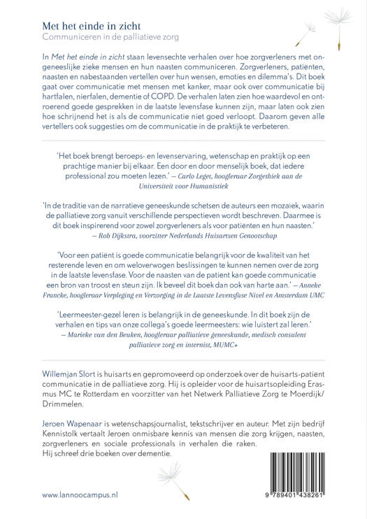 In Met het einde in zicht staan levensechte verhalen over hoe zorgverleners met ongeneeslijk zieke mensen en hun naasten communiceren. Zorgverleners, patiënten, naasten en nabestaanden vertellen over hun wensen, emoties en dilemma's.