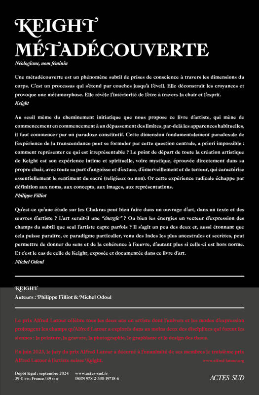 "Le point de départ de toute la création artistique de Keight est son expérience intime et spirituelle, voire mystique, éprouvée directement dans sa propre chair, avec toute sa part d'angoisse et d'extase, d'émerveillement et de terreur, qui caractérise essentiellement le sentiment du sacré (religieux ou non). Or, cette expérience radicale échappe par définition aux noms, aux concepts, aux images, aux représentations." Philippe Filliot