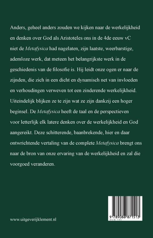 Aristoteles’ Metafysica is een van de meest invloedrijke filosofische boeken ooit. Het belangrijkste boek uit de geschiedenis van de metafysica verschijnt nu voor het eerst volledig in het Nederlands. De meesterlijk vertaalde en ingeleide tekst laat ons een werkelijkheid ervaren die we uit het zicht verloren lijken te zijn, al omgeeft ze ons op elk punt van het bestaan. Aan de hand van een uitgebreide inleiding en tal van noten neemt Schomakers de lezer mee door deze canonieke tekst.