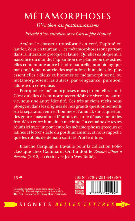 Acteon le chasseur transforme en cerf, Daphne en laurier, Zeus en taureau... les metamorphoses sont partout dans la litterature grecque et latine. Qu'elles expliquent la naissance du monde, l'apparition des plantes ou des astres, elles content une autre histoire naturelle, non biologique mais poetique, nourrie des aspirations humaines les plus essentielles: dieux et hommes se metamorphosent, ou metamorphosent les autres, par vengeance, punition, jalousie ou convoitise.Pourquoi ces metamorphoses nous parlent-elles tant ? C'est qu'elles disent notre secret desir de vivre une autre vie, sous une autre identite. Ces tres anciens recits nous plongent dans les origines de nos grands questionnements sur la separation entre l'homme et l'animal, sur la question des genres masculin et feminin, et sur le depassement des frontieres entre humain et machine. La centaine de textes reunis ici trace un pont entre les metamorphoses grecques et latines et le XXIe siecle du posthumanisme, et nous rappelle que les robots de demain sont les Protee d'hier.