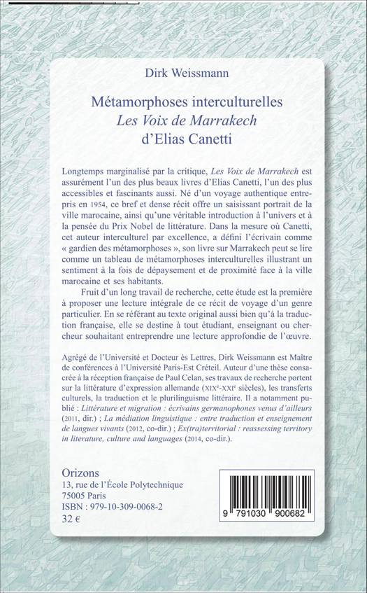 Longtemps marginalisé par la critique, Les Voix de Marrakech est assurément l'un des plus beaux livres d'Elias Canetti. Né d'un voyage authentique entrepris en 1954, il offre un saisissant portrait de la ville marocaine, ainsi qu'une véritable introduction à l'univers et à la pensée du Prix Nobel de littérature. Fruit d'un long travail de recherche, cette étude est la première à en proposer une lecture intégrale. En se référant au texte original aussi bien qu'à la traduction française, elle se destine à tout étudiant, enseignant ou chercheur souhaitant entreprendre une lecture approfondie de l'uvre.