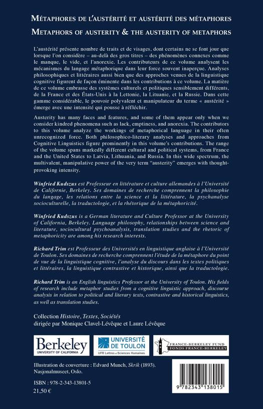Dans ces articles en anglais et en français, les contributeurs interrogent des positions divergentes, souvent provocantes concernant le langage de l'austérité dans la politique, la philosophie et la littérature. Le volume découvre des dynamiques et des tensions entre les concepts et les interrogations philosophico-littéraires portées sur ces mêmes concepts. Le pouvoir polyvalent et manipulateur du terme "austérité" émerge avec une intensité qui pousse à réfléchir.