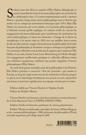 Sixieme tome des OEuvres completes d'Elie Halevy, Metaphysique et morale rassemble les ecrits d'un jeune philosophe a la recherche de la philosophie vraie. Ce corpus impressionnant suit le moment Platon, premier temps d'une oeuvre philosophique rare et decisive qui evolue vers la critique du mouvement historique apres 1914. Mais Elie Halevy ne renoncera, de sa vie entiere, ni a la pensee philosophique ni a l'attitude morale qu'elle implique. Le volume revele de concert les engagements du jeune philosophe pour transformer les institutions du savoir philosophique, et meme les reinventer a l'image de la Revue de metaphysique et de morale creee en 1893, avec ses satellites lances moins de dix ans plus tard, les congres internationaux de philosophie, la Societe francaise de philosophie, le Vocabulaire critique et technique de la philosophie. Ces aventures collectives sont portees par le quatuor que composent Elie Halevy et ses amis, Xavier Leon, Leon Brunschvicg et Celestin Bougle. Ces engagements intellectuels, pratiques et collectifs, affichant meme une ambition europeenne, conferent une portee singuliere a l'oeuvre philosophique d'Elie Halevy. Au sortir de la guerre mondiale, arme de la philosophie et de l'histoire, Elie Halevy parvient a concevoir l'ere des tyrannies qui monte en Europe, au long de vingt annees encore de recherches et d'ecrits, jusqu'a ce que la mort interrompe brutalement une pensee en acte, aujourd'hui meconnue et pourtant capitale pour son epoque comme pour la notre.
