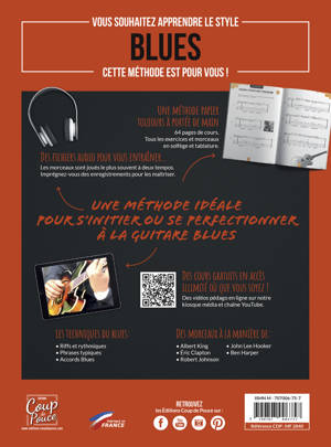 Ben Harper Eric Clapton Albert King John Lee Hooker Robert Johnson Tous les exercices et morceaux sont écrits en solfège et tablatures. Ils sont enregistrés sur les pistes audio afin de vous entraîner.