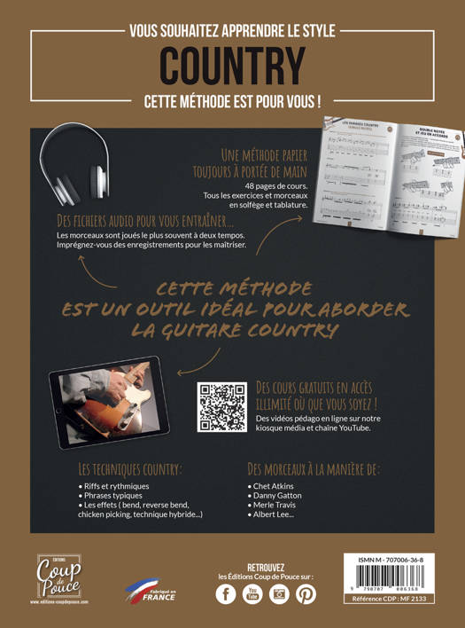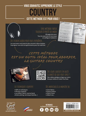 Toutes les techniques de la guitare Country décortiquées Les riffs Les rythmiques Les phrases incontournables de la Country Un large chapitre est consacré aux effets utilisés en Country : bend, reverse bend, chicken picking, technique hybride, single notes.