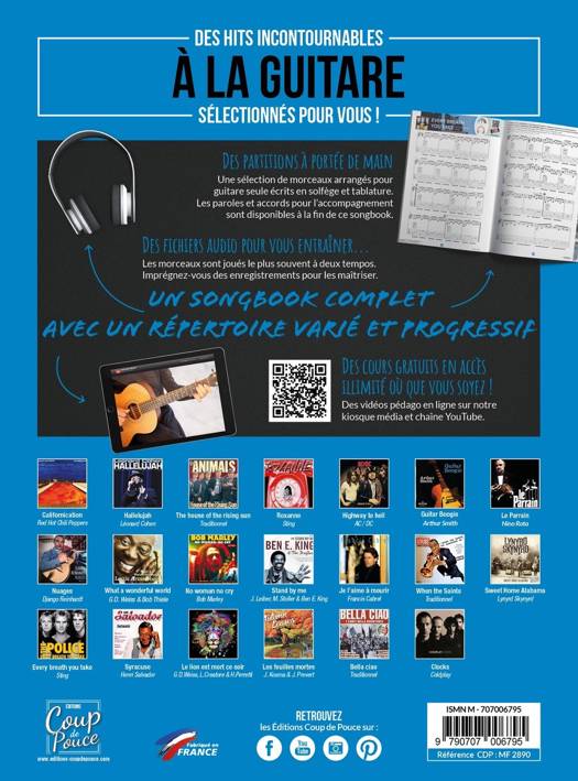 1 livre de 72 pages + les fichiers audio et vidéos sur notre kiosque média Dans ce songbook pour guitare volume 1, Vous trouverez une sélection de morceaux de différents niveaux accessibles dès les premières années de guitare. Pour chaque morceau vous disposez d’une partition écrite en solfège et tablature, de pistes audio ainsi qu’une vidéo le plus souvent enregistrées à tempo normal et à tempo plus lent. Nous avons simplifié les titres originaux en les classant par niveau pour que vous puissiez les interpréter plus facilement :