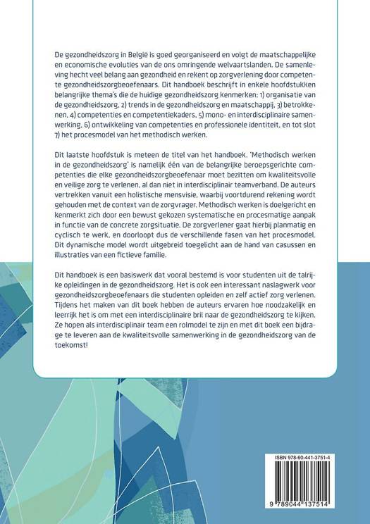 Dit laatste hoofdstuk is meteen de titel van het handboek. ‘Methodisch werken in de gezondheidszorg’ is namelijk één van de belangrijke beroepsgerichte competenties die elke gezondheidszorgbeoefenaar moet bezitten om kwaliteitsvolle en veilige zorg te verlenen, al dan niet in interdisciplinair teamverband. De auteurs vertrekken vanuit een holistische mensvisie, waarbij voortdurend rekening wordt gehouden met de context van de zorgvrager. Methodisch werken is doelgericht en kenmerkt zich door een bewust gekozen systematische en procesmatige aanpak in functie van de concrete zorgsituatie. De zorgverlener gaat hierbij planmatig en cyclisch te werk, en doorloopt dus de verschillende fasen van het procesmodel. Dit dynamische model wordt uitgebreid toegelicht aan de hand van casussen en illustraties van een fictieve familie.