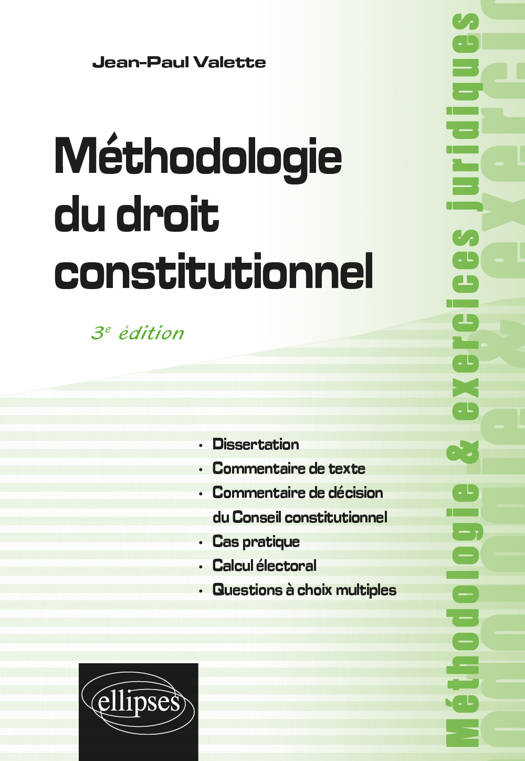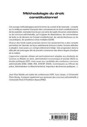 Cet ouvrage méthodologique prend la forme du conseil et de l'exemple : conseils sur la meilleure manière d'acquérir des connaissances en droit constitutionnel et de les exploiter, exemples fournis par une série de sujets d'examen universitaires ou de concours administratifs, qu’il s’agisse de dissertations, de commentaires de texte ou de décision du Conseil constitutionnel, de calculs électoraux ou de cas pratiques, de questions à choix multiples (QCM).