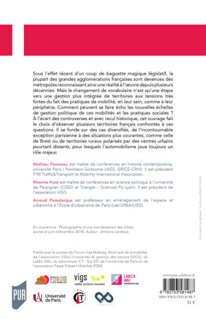 La plupart des grandes agglomérations françaises sont récemment devenues des métropoles, territoires aux tensions très fortes du fait des pratiques de mobilité, en leur sein comme à leur périphérie. à l'écart des controverses et avec recul historique, cet ouvrage fait le choix d'observer plusieurs territoires français confrontés à ces questions de mobilité. Il se fonde sur des cas diversifiés, de l'incontournable exception parisienne à des situations plus courantes, comme celle de Brest ou de territoires ruraux polarisés par des centres urbains pourtant distants, pour lesquels l'automobilisme joue toujours un rôle majeur.