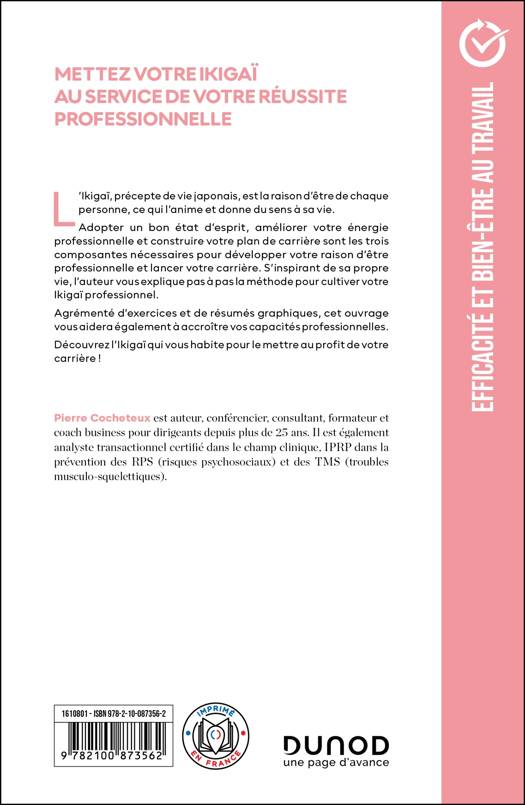 L’Ikigaï, précepte de vie japonais, est la raison d’être de chaque personne, ce qui l’anime et donne du sens à sa vie. Adopter un bon état d’esprit, améliorer votre énergie professionnelle et construire votre plan de carrière sont les trois composantes nécessaires pour développer votre raison d’être professionnelle et lancer votre carrière. S’inspirant de sa propre vie, l’auteur vous explique pas à pas la méthode pour cultiver votre Ikigaï professionnel. Agrémenté d’exercices et de résumés graphiques, cet ouvrage vous aidera également à accroître vos capacités professionnelles. Découvrez l’Ikigaï qui vous habite pour le mettre au profit de votre carrière !