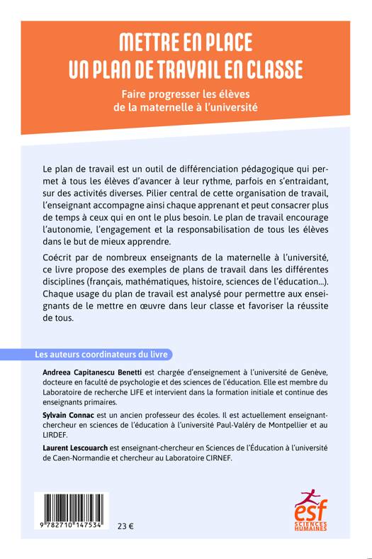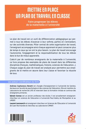 Coécrit par de nombreux enseignants de la maternelle à l'université, ce livre propose des exemples de plans de travail dans les différentes disciplines (français, mathématiques, histoire, sciences de l'éducation...). Chaque usage du plan de travail est analysé pour permettre aux enseignants de le mettre en oeuvre dans leur classe et favoriser la réussite de tous.