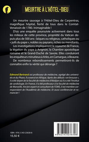 Un meurtre sauvage à l’Hôtel-Dieu de Carpentras, magnifique hôpital, fierté de tous dans le Comtat-Venaissin de 1780. Inimaginable ! D’où une enquête poursuivie activement dans tous les milieux de cette province, propriété du Vatican depuis plus de 500 ans : laïques ou religieux, catholiques ou « juifs du pape », nobles ou paysans, riches ou mendiants. Les investigations impliqueront le royaume de France, la légation du pape à Avignon, la Chambre apostolique romaine et le Grand-Duché de Savoie. Elles conduiront les enquêteurs minutieux à Arles, en Camargue, à Beaune. De nombreux rebondissements permettront-ils de connaître enfin la vérité qui dérange ?