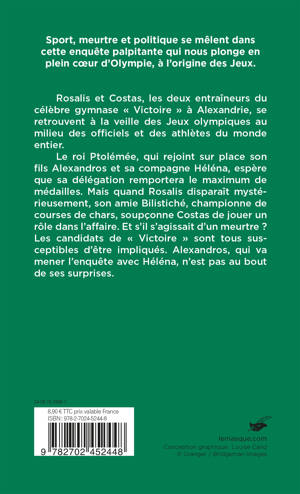 Le roi Ptolémée, qui rejoint sur place son fils Alexandros et sa compagne Héléna, espère que sa délégation remportera le maximum de médailles. Mais quand Rosalis disparaît mystérieusement, son amie Bilistiché, championne de courses de chars, soupçonne Costas de jouer un rôle dans l’affaire. Et s’il s’agissait d’un meurtre ?