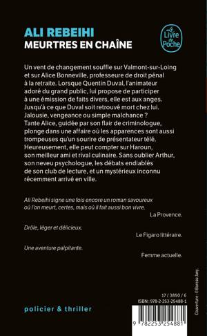 Un vent de changement souffle sur Valmont-sur-Loing et sur Alice Bonneville, professeure de droit pénal à la retraite. Lorsque Quentin Duval, l’animateur adoré du grand public, lui propose de participer à une émission de faits divers, Alice est aux anges. Jusqu’à ce que Duval soit retrouvé mort chez lui. Jalousie, vengeance ou simple malchance ? Tante Alice, guidée par son flair de criminologue, plonge dans une affaire où les apparences sont aussi trompeuses qu’un sourire de présentateur télé. Heureusement, elle peut compter sur Haroun, son meilleur ami et rival culinaire. Sans oublier Arthur, son neveu psychologue, les débats endiablés de son club de lecture, et un mystérieux inconnu récemment arrivé en ville.