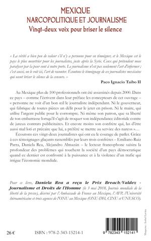 Au Mexique, plus de 100 journalistes ont été assassinés depuis 2000 pour avoir dénoncé le narcotrafic et la corruption. Grâce à ces vingt-deux témoignages de journalistes, le lecteur saisira la profondeur des problèmes qui touchent la société d'un pays démocratique lorsque ce dernier est confronté à la puissance et à la violence d'un trafic qui irrigue l'économie mondiale.