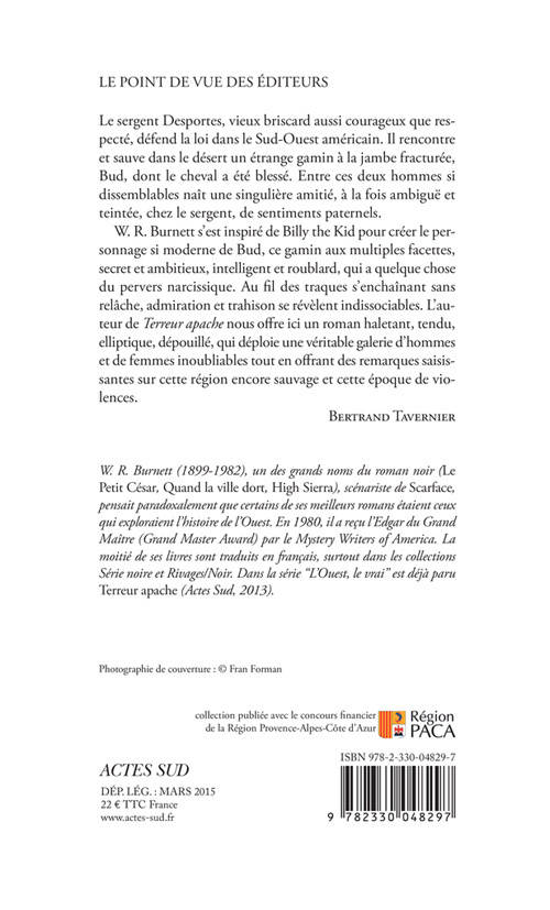 W. R. Burnett s'est inspiré de Billy the Kid pour créer le personnage si moderne de Bud, ce gamin aux multiples facettes, secret et ambitieux, intelligent et roublard, qui a quelque chose du pervers narcissique. Au fi l des traques s'enchaînant sans relâche, admiration et trahison se révèlent indissociables. L'auteur de «Terreur apache» nous off re ici un roman haletant, tendu, elliptique, dépouillé, qui déploie une véritable galerie d'hommes et de femmes inoubliables tout en off rant des remarques saisissantes sur cette région encore sauvage et cette époque de violences.