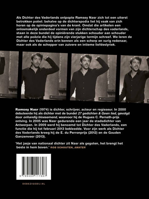 Als Dichter des Vaderlands ontpopte Ramsey Nasr zicht tot een uiterst betrokken poëet: behalve op de dichterspodia liet hij vaak van zich horen op de opiniepagina's van de krant. Omdat die artikelen een onlosmakelijk onderdeel vormen van zijn dichterschap des vaderlands, staan in deze bundel de opiniërende stukken schouder aan schouder met alle poëzie die hij tijdens zijn vierjarige termijn schreef. We leren de Dichter des Vaderlands erin kennen als een scherp en vurig redenaar, maar ook als schepper van zuivere en intieme liefdeslyriek.
