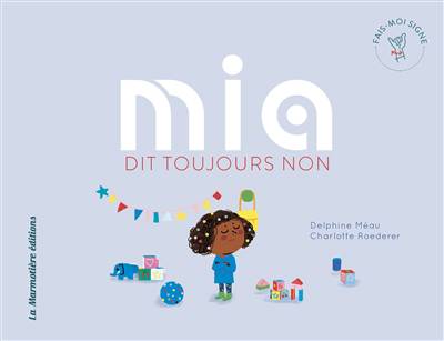 Aujourd'hui, Mia n'a qu'un seul mot à la bouche : non ! Fais-moi signe, une collection pour les tout-petits à lire avec ou sans les mains ! Enfin des histoires pensées pour être lues aux enfants de moins de trois ans en utilisant si on le souhaite la communication gestuelle associée à la parole. Chaque double-page comporte au moins un mot qui peut être signé, avec un dessin décrivant le geste. A droite une belle illustration pleine page de Charlotte Roederer. Les rabats de la couverture reprennent tous les signes du livre avec, pour chacun d’eux, un descriptif du mouvement, en plus du dessin.