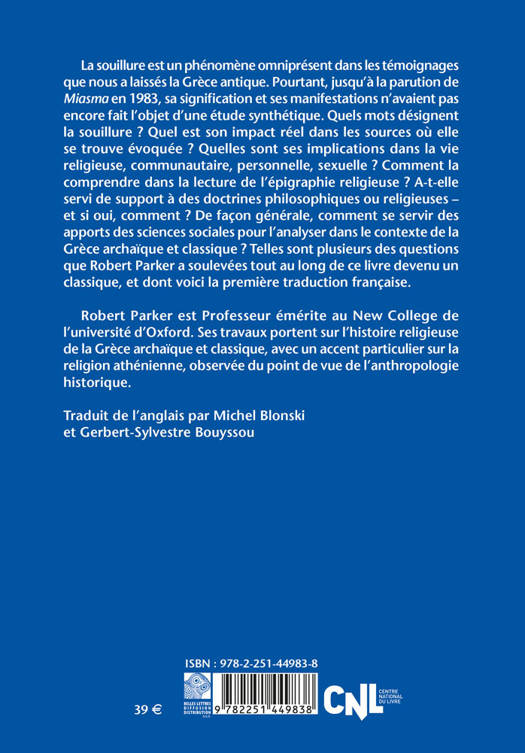 La souillure est un phenomene omnipresent dans les temoignages que nous a laisses la Grece antique. Pourtant, jusqu'a la parution de Miasma en 1983, sa signification et ses manifestations n'avaient pas encore fait l'objet d'une etude synthetique. Quels mots designent la souillure ? Quel est son impact reel dans les sources ou elle se trouve evoquee ? Quelles sont ses implications dans la vie religieuse, communautaire, personnelle, sexuelle ? Comment la comprendre dans la lecture de l'epigraphie religieuse ? A-t-elle servi de support a des doctrines philosophiques ou religieuses - et si oui, comment ? De facon generale, comment se servir des apports des sciences sociales pour l'analyser dans le contexte de la Grece archaique et classique ? Telles sont plusieurs des questions que Robert Parker a soulevees tout au long de ce livre devenu un classique, et dont voici la premiere traduction francaise.