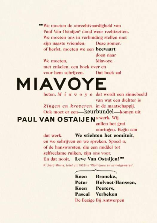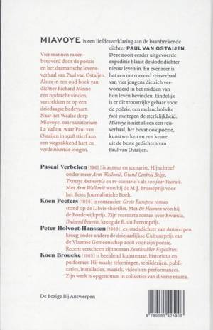 Miavoye is een liefdesverklaring aan Paul van Ostaijen, ons ‘Zot Polleke’. Deze nooit eerder uitgevoerde expeditie blaast de dode dichter nieuw leven in. En evenzeer is het een ontroerend reisverhaal van vier jongens die zich verwonderd in het midden van hun leven bevinden. Eindelijk is er dit troostrijke gebaar voor de poëzie, een melancholieke