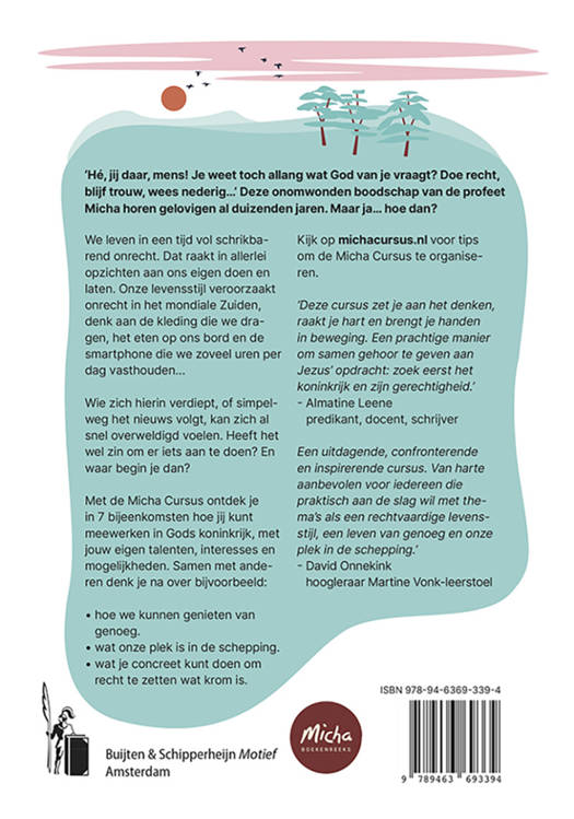 Met de Micha Cursus ontdek je in zeven bijeenkomsten hoe jij kunt meewerken in Gods koninkrijk, met jouw eigen talenten, interesses en mogelijkheden. Samen met anderen denk je na over bijvoorbeeld: • hoe we kunnen genieten van genoeg. • wat onze plek is in de schepping. • wat je concreet kunt doen om recht te zetten wat krom is.