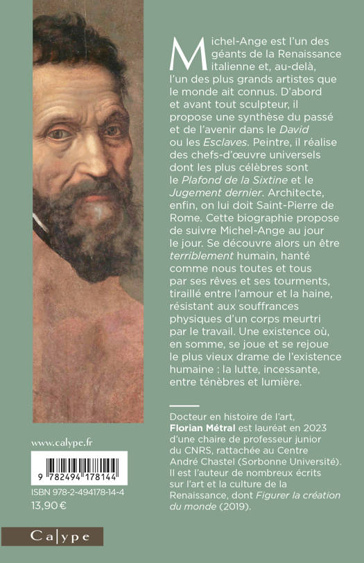 Michel-Ange est l’un des géants de la Renaissance italienne et au-delà, l’un des plus grands artistes que le monde ait connus. D’abord et avant tout sculpteur, il propose une synthèse du passé et de l’avenir dans le David ou les Esclaves. Peintre, il réalise des chefs-d’oeuvre universels dont les plus célèbres sont le Plafond de la Sixtine et le Jugement dernier. Architecte, enfin, on lui doit Saint-Pierre de Rome. Cette biographie propose de suivre Michel-Ange au jour le jour. Se découvre alors un être terriblement humain, hanté comme nous toutes et tous par ses rêves et ses tourments, tiraillé entre l’amour et la haine, résistant aux souffrances physiques d’un corps meurtri par le travail. Une existence où, en somme, se joue et se rejoue le plus vieux drame de l’existence humaine : la lutte, incessante, entre ténèbres et lumière.