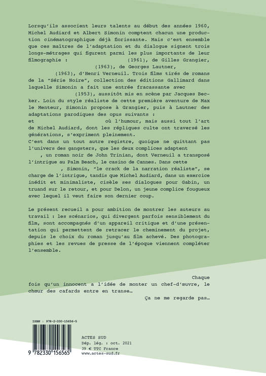 Lorsqu'ils associent leurs talents au début des années 1960, Michel Audiard et Albert Simonin comptent chacun une production cinématographique déjà florissante. Mais c'est ensemble que ces maîtres de l'adaptation et du dialogue signent trois longs-métrages qui figurent parmi les plus importants de leur filmographie : Le Cave se rebiff e (1961), de Gilles Grangier, Les Tontons flingueurs (1963), de Georges Lautner, Mélodie en sous-sol (1963), d'Henri Verneuil. Trois films tirés de romans de la "Série Noire", collection des éditions Gallimard dans laquelle Simonin a fait une entrée fracassante avec Touchez pas au grisbi ! (1953), aussitôt mis en scène par Jacques Becker. Loin du style réaliste de cette première aventure de Max le Menteur, Simonin propose à Grangier, puis à Lautner des adaptations parodiques des opus suivants : Le Cave se rebiffe et Les Tontons flingueurs où l'humour, mais aussi tout l'art de Michel Audiard, dont les répliques culte ont traversé les générations, s'expriment pleinement. C'est dans un tout autre registre, quoique ne quittant pas l'univers des gangsters, que les deux complices adaptent The Big Grab, un roman noir de John Trinian, dont Verneuil a transposé l'intrigue au Palm Beach, le casino de Cannes. Dans cette Mélodie en sous-sol, Simonin, "le crack de la narration réaliste", se charge de l'intrigue, tandis que Michel Audiard, dans un exercice inédit et minimaliste, cisèle ses dialogues pour Gabin, un truand sur le retour, et pour Delon, un jeune complice fougueux avec lequel il veut faire son dernier coup. Le présent recueil a pour ambition de montrer les auteurs au travail : les scénarios, qui divergent parfois sensiblement du film, sont accompagnés d'un appareil critique et d'une présentation qui permettent de retracer le cheminement du projet, depuis le choix du roman jusqu'au film achevé. Des photographies et les revues de presse de l'époque viennent compléter l'ensemble. L'édition est établie, présentée et annotée par Franck Lhomeau, à qui l'on doit plusieurs études sur Michel Audiard, ainsi que la publication de ses chroniques cinématographiques, Chaque fois qu'un innocent a l'idée de monter un chef-d'oeuvre, le choeur des cafards entre en transe... (Joseph K., 2020), et de ses reportages et nouvelles inédites, Ça ne me regarde pas... (Joseph K., 2021).