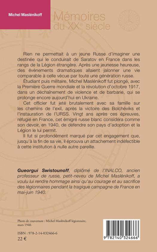Rien ne permettait à un jeune Russe d'imaginer une destinée qui le conduirait de Saratov en France dans les rangs de la Légion étrangère. Après une jeunesse heureuse, des événements dramatiques allaient jalonner une vie comparable à celle vécue par toute une génération russe. Étudiant puis militaire, Michel Maslénikoff fut plongé, avec la Première Guerre mondiale et la révolution d'octobre 1917, dans un déchaînement de violence et de barbarie, qui se prolonge encore aujourd'hui en Ukraine. Cet offi cier fut jeté brutalement avec sa famille sur les chemins de l'exil, après la victoire des Bolchéviks et l'instauration de l'URSS. Vingt ans après ces épreuves, réfugié en France, cet émigré russe blanc considéra comme son devoir, en 1940, de défendre son pays d'adoption et la Légion le lui permit. Il fut si profondément marqué par cet engagement que, jusqu'à la fi n de sa vie, il éprouva un attachement indéfectible à cette institution à nulle autre pareille.