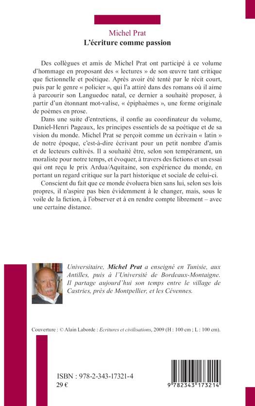 Des collègues et amis de Michel Prat ont participé à ce volume d'hommage en proposant des « lectures » de son oeuvre tant critique que fictionnelle et poétique. Après avoir été tenté par le récit court, puis par le genre « policier », qui l'a attiré dans des romans où il aime à parcourir son Languedoc natal, ce dernier a souhaité proposer, à partir d'un étonnant mot-valise, « épiphaèmes », une forme originale de poèmes en prose. Dans une suite d'entretiens, il confie au coordinateur du volume, Daniel-Henri Pageaux, les principes essentiels de sa poétique et de sa vision du monde. Michel Prat se perçoit comme un écrivain « latin » de notre époque, c'est-à-dire écrivant pour un petit nombre d'amis et de lecteurs cultivés. Il a souhaité être, selon son tempérament, un moraliste pour notre temps, et évoquer, à travers des fictions et un essai qui ont reçu le prix Ardua/Aquitaine, son expérience du monde, en portant un regard critique sur la part historique et sociale de celui-ci.