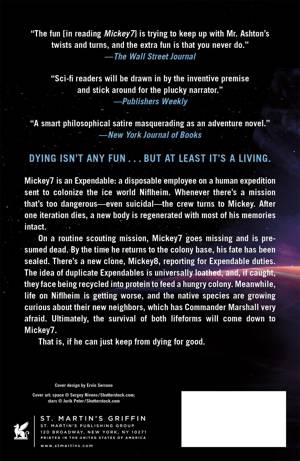 Dying isn't any fun...but at least it's a living. Mickey Barnes is an Expendable: a disposable employee on a human expedition sent to colonize the ice world Niflheim. Whenever there's a mission that's too dangerous--even suicidal--the crew turns to Mickey. After one iteration dies, a new body is regenerated with most of his memories intact. After six deaths, Mickey7 understands the terms of his deal...and why it was the only colonial position unfilled when he took it. On a routine scouting mission, Mickey7 goes missing and is presumed dead. By the time he returns to the colony base, surprisingly helped back by native life, his fate has been sealed. There's a new clone, Mickey8, reporting for Expendable duties, and there can only be one Expendable. If Mickey7 reports his survival to Command, one of them is going into the recycler. If he doesn't and they're caught, they both are. Meanwhile, life on Niflheim is getting worse. The atmosphere is unsuitable for humans, food is in short supply, and terraforming is going poorly. The native species are growing curious about their new neighbors, and that curiosity has Commander Marshall very afraid. Ultimately, the survival of both lifeforms will come down to Mickey7. That is, if he can just keep from dying for good.We publiceren alleen reviews die voldoen aan de voorwaarden voor reviews. Bekijk onze voorwaarden voor reviews.