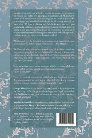 ‘Middlemarch is het ultieme boek over de mens. Hoe mensen met elkaar omgaan, hoe grappig en suf en berekenend en hilarisch ze kunnen zijn, en hoe onverwacht heroïsch. Eigenlijk hoeft iedereen gedurende zijn leven maar een roman te hebben gelezen. Déze roman. Alles zit erin.’ – Ellen Deckwitz