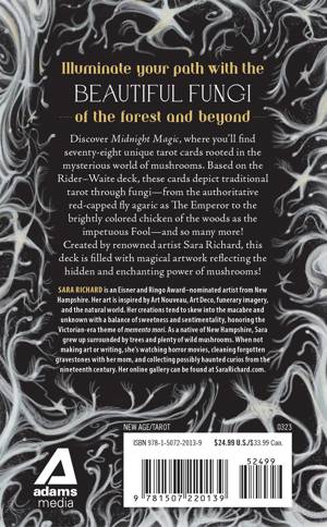 Featuring dark, dreamy illustrations of the beautiful fungi of the forest discover your fortune with Midnight Magic, which reflects the themes and archetypes of the traditional Rider Waite. Welcome to a tarot deck of mushrooms, where you'll find 78 unique tarot card designs based on the mysterious world of mushrooms. Based on the symbolism of the Rider Waite deck, these cards depict traditional tarot archetypes through images of fungi, from the authoritative, red-capped Fly Agaric as the Emperor to the brightly colored Chicken of the Woods as the impetuous Fool and so much more!