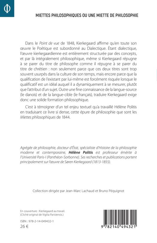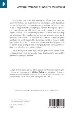 Dans le Point de vue de 1848, Kierkegaard affirme qu'en toute son oeuvre le Poétique est subordonné au Dialectique. Étant dialectique, l'oeuvre kierkegaardienne est entièrement structurée par des concepts, et par là intégralement philosophique, même si Kierkegaard répugne à se parer du titre de philosophe comme il répugne à se parer du titre de chrétien: non seulement parce que ces deux titres sont trop souvent usurpés dans la culture de son temps, mais encore parce que la qualification de l'existant par lui-même est forcément risquée lorsque le qualificatif est un idéal auquel il a dynamiquement à se mesurer, plutôt que l'attribut d'un sujet. Outre une fine connaissance de la langue-source (le danois) et de la langue-cible (le français), traduire Kierkegaard exige donc une solide formation philosophique. C'est à témoigner d'un tel enjeu textuel qu'a travaillé Hélène Politis en traduisant ce livre si dense, cette épure de philosophie que sont les Miettes philosophiques de 1844.