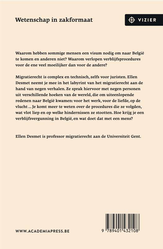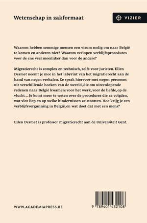 Migratierecht is complex en technisch, zelfs voor juristen. Ellen Desmet neemt je mee in het labyrint van het migratierecht aan de hand van negen verhalen. Ze sprak hiervoor met negen personen uit verschillende hoeken van de wereld, die om uiteenlopende redenen naar België kwamen: voor het werk, voor de liefde, op de vlucht ... Je komt meer te weten over de procedures die ze volgden, wat vlot liep en op welke hindernissen ze stootten. Hoe krijg je een verblijfsvergunning in België, en wat doet dat met een mens?