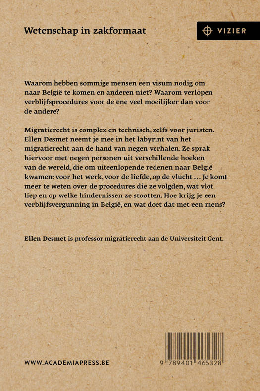 Migratierecht is complex en technisch, zelfs voor juristen. Ellen Desmet neemt je mee in het labyrint van het migratierecht aan de hand van negen verhalen. Ze sprak hiervoor met negen personen uit verschillende hoeken van de wereld, die om uiteenlopende redenen naar België kwamen: voor het werk, voor de liefde, op de vlucht ... Je komt meer te weten over de procedures die ze volgden, wat vlot liep en op welke hindernissen ze stootten. Hoe krijg je een verblijfsvergunning in België, en wat doet dat met een mens?