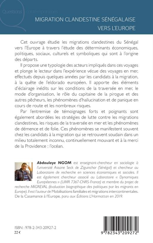 Cet ouvrage étudie les migrations clandestines du Sénégal vers l'Europe à travers l'étude des déterminants économiques, politiques, sociaux, culturels et symboliques qui sont à l'origine des départs. Il propose une typologie des acteurs impliqués dans ces voyages et plonge le lecteur dans l'expérience vécue des voyages en mer. Par l'entremise de témoignages forts sont également abordées les stratégies de lutte contre les migrations clandestines, les risques de la traversée en mer et les phénomènes de démence et de folie.