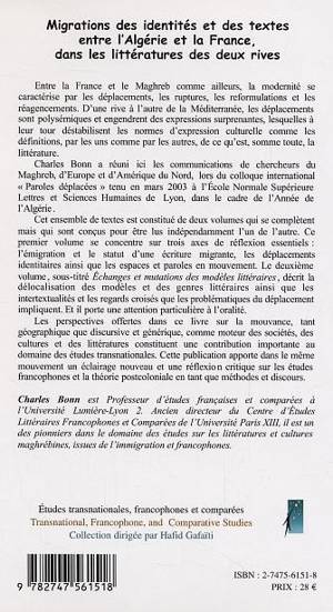 Entre la France et le Maghreb comme ailleurs, la modernité se caractérise par les déplacements, les ruptures, les reformulations et les agencements. D'une rive à l'autre de la Méditerranée, les déplacements sont polysémiques. L'auteur réunit dans cet ouvrage les communications entre les chercheurs du colloque international : "Paroles Déplacées", tenu en mars 2003 à Lyon. Ce premier volume se concentre sur trois axes essentiels : l'émigration et le statut d'une écriture migrante, les déplacements identitaires ainsi que les espaces et les paroles en mouvement.