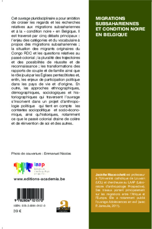 Cet ouvrage pluridisciplinaire est traversé par cinq débats principaux relatifs aux migrations subsahariennes et à la « condition noire » en Belgique : l'enjeu des catégories et du vocabulaire ; la situation des migrants originaires du Congo RDC ; la pluralité des trajectoires et des possibilités de réussite ; les transformations des rapports de famille ainsi que le rôle joué par les Églises pentecôtistes, et, enfin, les enjeux de participation politique dans les pays de vie et d'origine.