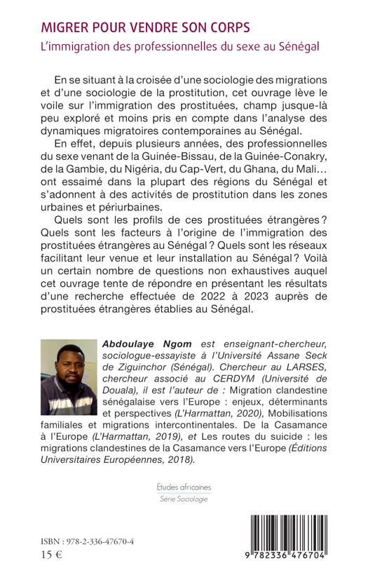 En se situant à la croisée d’une sociologie des migrations et d’une sociologie de la prostitution, cet ouvrage lève le voile sur l’immigration des prostituées, champ jusque-là peu exploré et moins pris en compte dans l’analyse des dynamiques migratoires contemporaines au Sénégal. En effet, depuis plusieurs années, des professionnelles du sexe venant de la Guinée-Bissau, de la Guinée-Conakry, de la Gambie, du Nigéria, du Cap-Vert, du Ghana, du Mali… ont essaimé dans la plupart des régions du Sénégal et s’adonnent à des activités de prostitution dans les zones urbaines et périurbaines. Quels sont les profils de ces prostituées étrangères ? Quels sont les facteurs à l’origine de l’immigration des prostituées étrangères au Sénégal ? Quels sont les réseaux facilitant leur venue et leur installation au Sénégal ? Voilà un certain nombre de questions non exhaustives auquel cet ouvrage tente de répondre en présentant les résultats d’une recherche effectuée de 2022 à 2023 auprès de prostituées étrangères établies au Sénégal.