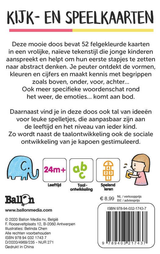 Deze mooie doos bevat 52 felgekleurde kaarten in een vrolijke, naïeve tekenstijl die jonge kinderen aanspreekt en helpt om nieuwe woordjes te leren op een speelse manier. Naast 100 woordjes die nauw aansluiten bij de leefwereld van je peuter, vind je in deze doos ook tal van ideeën voor leuke spelletjes, die aanpasbaar zijn aan de leeftijd en het niveau van ieder kind. Zo wordt naast de taalontwikkeling ook de sociale ontwikkeling van je kapoen gestimuleerd.