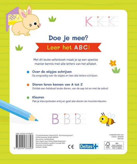 Met dit oefenboek voor kleuters leert je kind spelenderwijs alle letters van het alfabet! Elke pagina staat in het teken van één letter, compleet met een leuke kleurplaat van een dier dat met die letter begint en de letter in stipjes om naar hartenlust te oefenen!