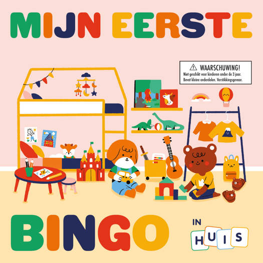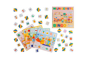De speelkaarten in Mijn eerste bingo in huis tonen de slaapkamer, de badkamer, de keuken en de woonkamer, waar kinderen plaatjes zoeken in een bekende omgeving. Op elke kaarten moeten tien voorwerpen gevonden worden: die eerste die ze allemaal heeft, roept BINGO!"