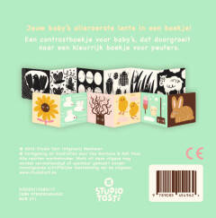 Een contrastboekje om het liggen op de buik te stimuleren bij baby’s, dat doorgroeit naar een kleurrijk boekje voor peuters.